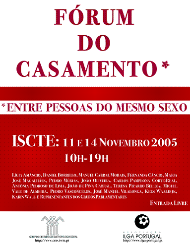 1. O Fórum do Casamento ultrapassou as expectativas. Estiveram presentes pessoas "gradas" das ciências sociais em Portugal que, não trabalhando directamente sobre o assunto, perceberam claramente quanto ele ajuda a perceber melhor os desafios contemporâneos das CS na área do parentesco, família, género e similares; estiveram presentes pessoas da área do Direito, o que permitiu um raro diálogo entre áreas infelizmente demasiado afastadas. O facto de o Centro de Estudos de Antropologia Social do ISCTE e a Associação ILGA-Portugal se terem juntado nesta iniciativa augura muito de bom sobre a necessária relação entre ciência e sociedade. Quanto às ausências - académicas dentro da área (e da "casa"), partidárias, associativas? - cada um sabe de si.